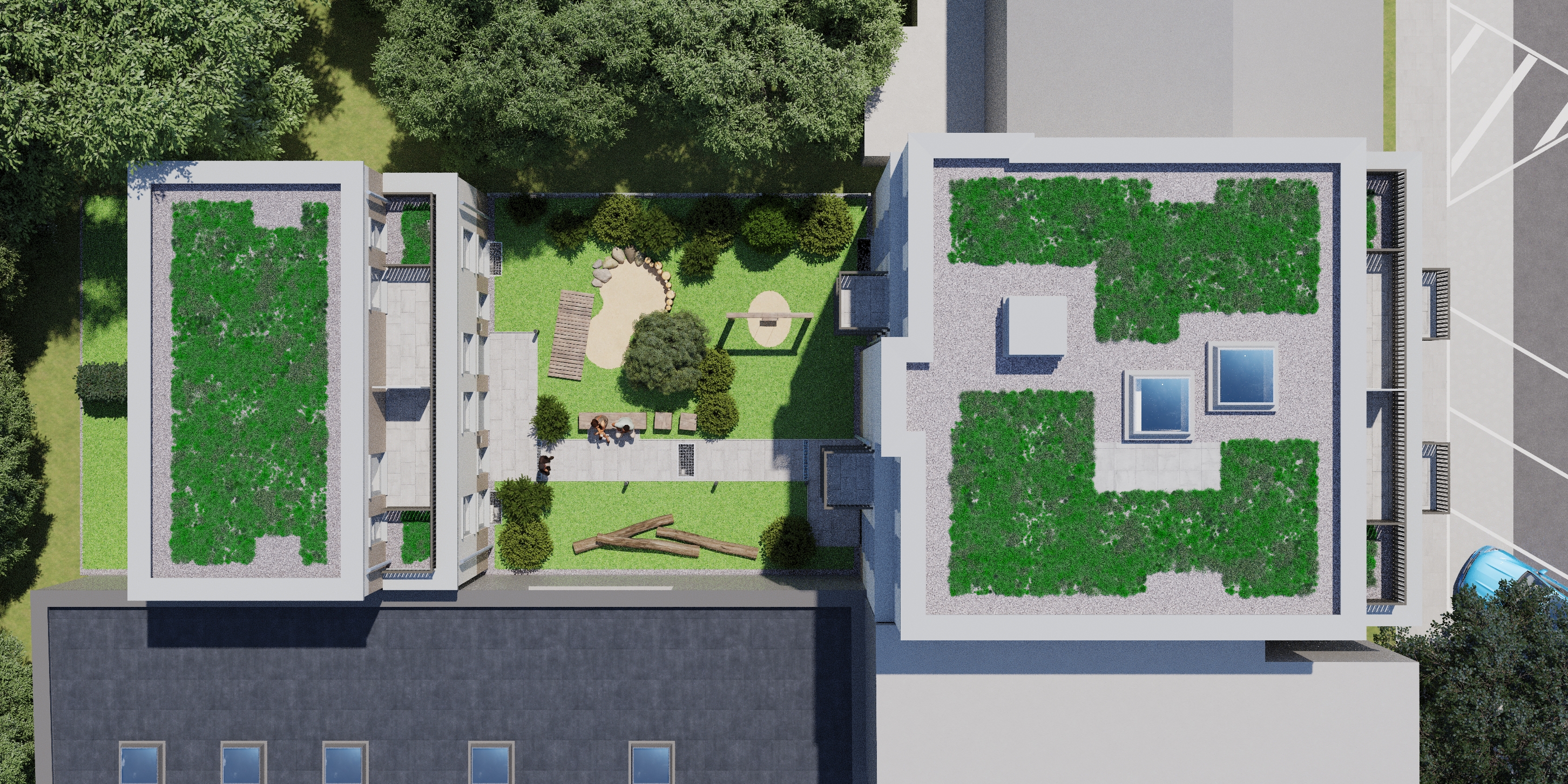 Bereits beim ersten Anblick überzeugt die moderne Fassade mit ihren klaren Linien. Die Stadthäuser im rückwärtigen Bereich haben einen diskreten Zugang durch den Garten, das Mehrfamilienhaus begrüßt mit einem eleganten Eingangsbereich und barrierearmen Zugängen.