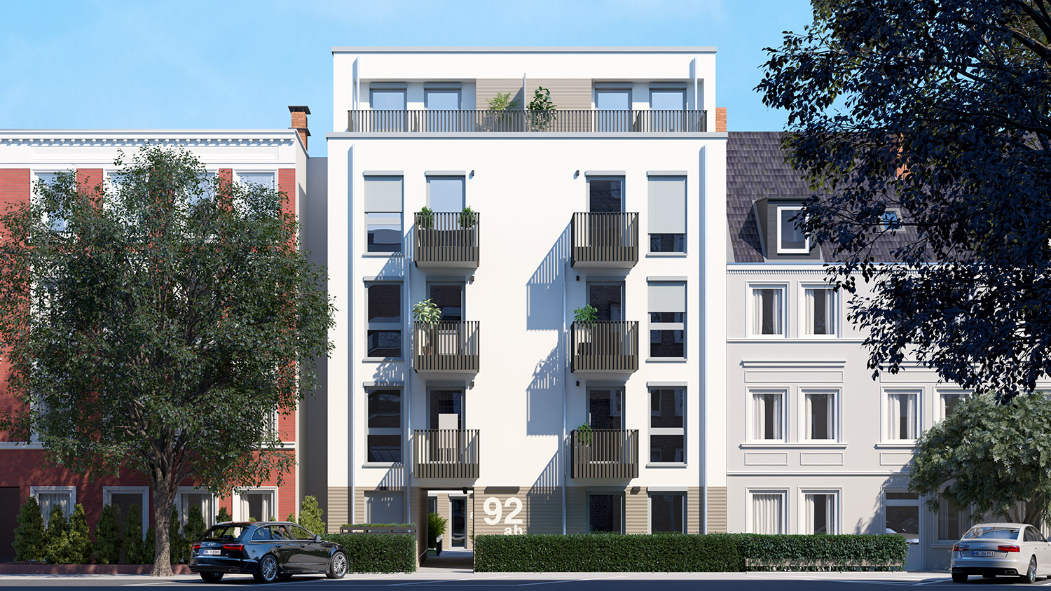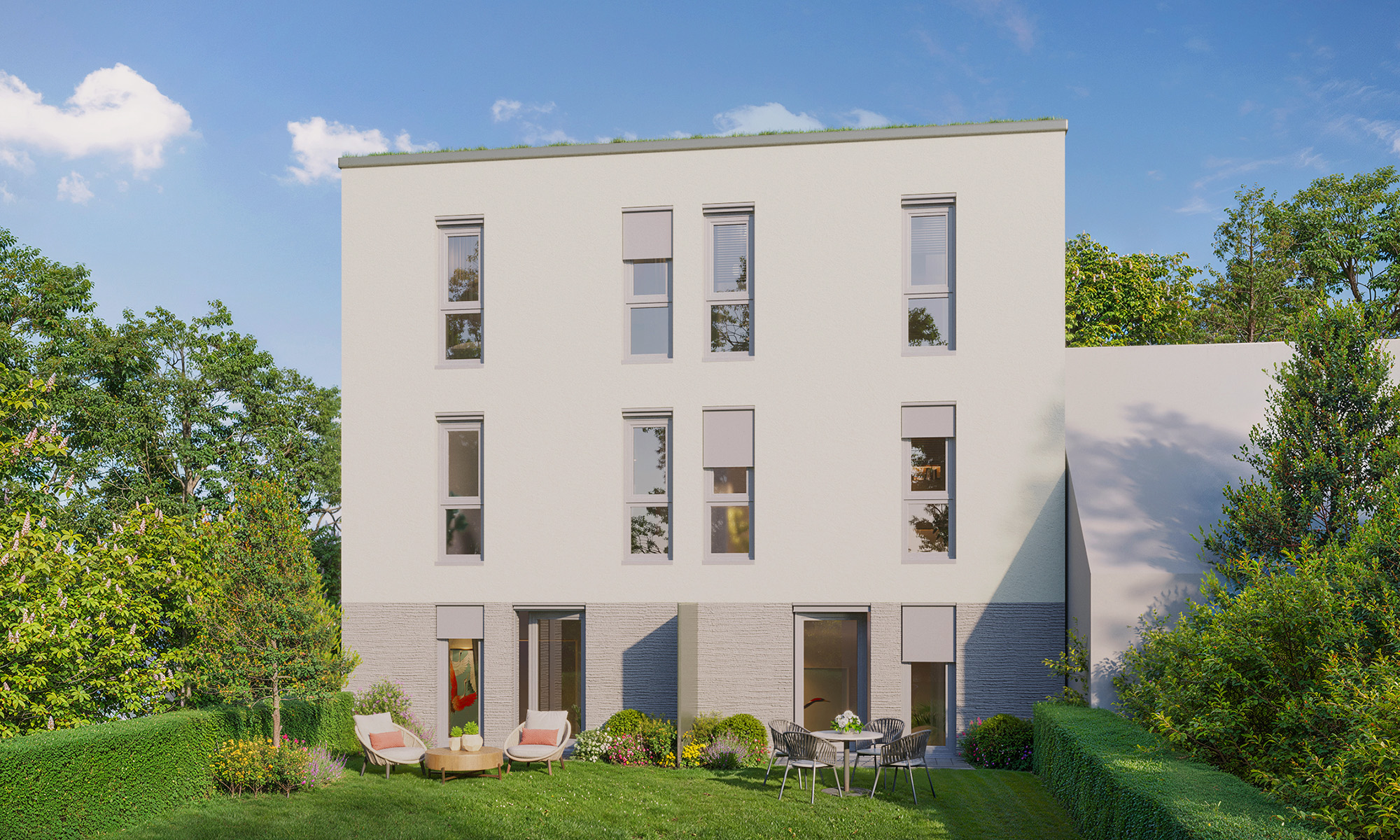 Bereits beim ersten Anblick überzeugt die moderne Fassade mit ihren klaren Linien. Die Stadthäuser im rückwärtigen Bereich haben einen diskreten Zugang durch den Garten, das Mehrfamilienhaus begrüßt mit einem eleganten Eingangsbereich und barrierearmen Zugängen.